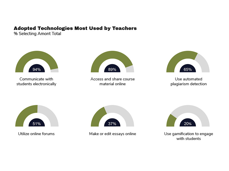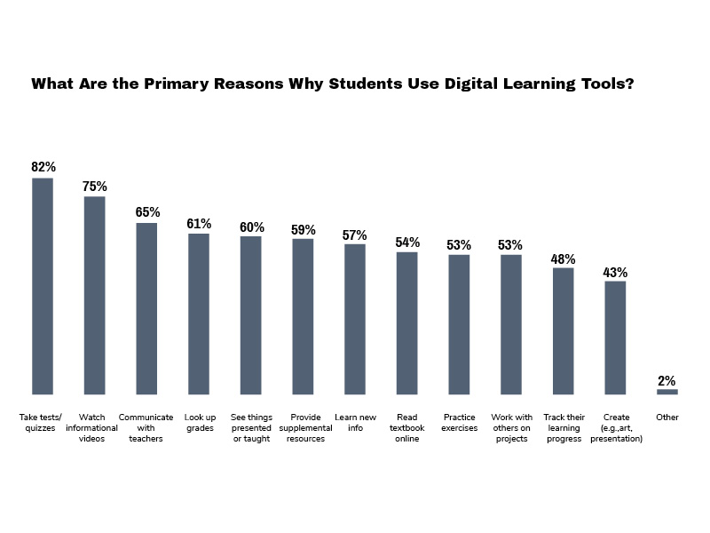 Students themselves use digital learning tools for a wide range of uses. Eighty-two percent of our panel of educators said that they are using technology to “take tests and quizzes.” Just below that, our pool of respondents said that 75% of students watch informational videos as part of their learning process. The range of uses our panelists cited (“communicate with teachers” at 65%, “look up grades” at 62%, etc.) suggest that institutions are using multiple technologies to satisfy student, teacher, and administrative needs.