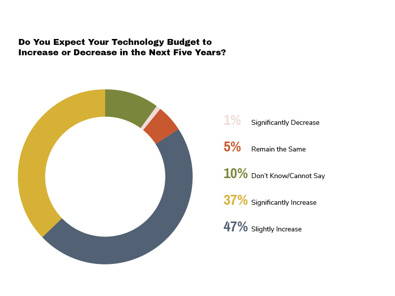 When we asked our panel about whether they expect their technology budget to increase or decrease, a marginal 1% of respondents said that they expected a significant decrease in their tech budgets. The remaining 89% expected their budget to either remain the same or increase over the next five years.