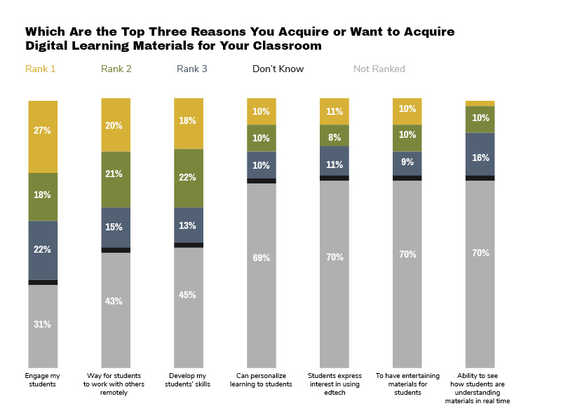 The respondents to our survey suggest that the reasoning behind potential tech budget increases doesn’t necessarily focus on remote learning. Remote learning is a factor — 56% of those we surveyed said it was a top factor for acquiring digital learning materials for the classroom. A significantly larger number of respondents (71%) said that they wanted tech to “engage my students,” a need that is likely to remain the same whether the education is in person or remote. Another 53% said that edtech helped them develop their students’ skills — a need that also can be independent of learning location.