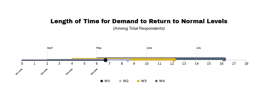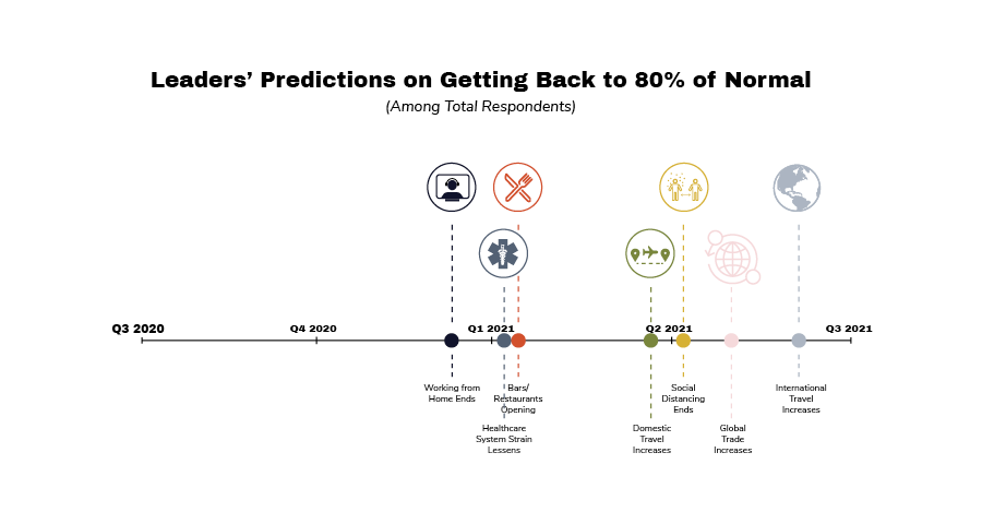 While the executives we surveyed do not expect to get to even 80% of normal until at least late Q4, they said they believed recovery will start with the lifting of stay-at-home orders and continue through the reopening and restarting of the domestic and international economies.