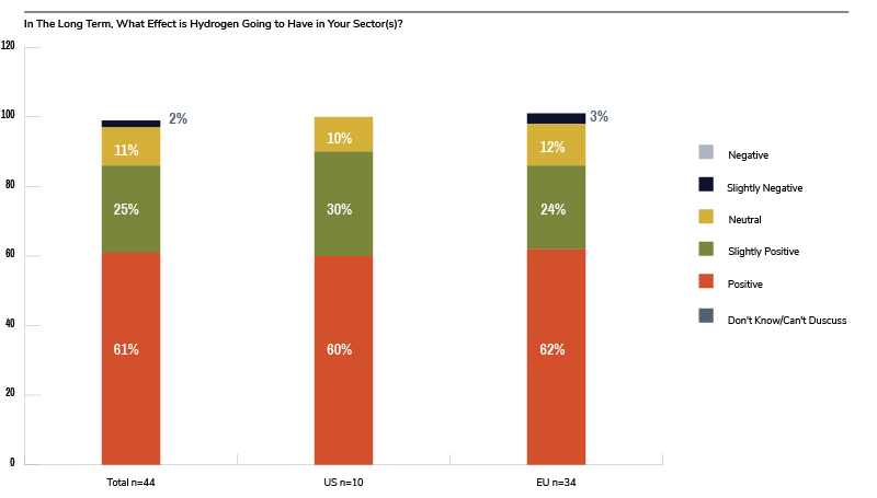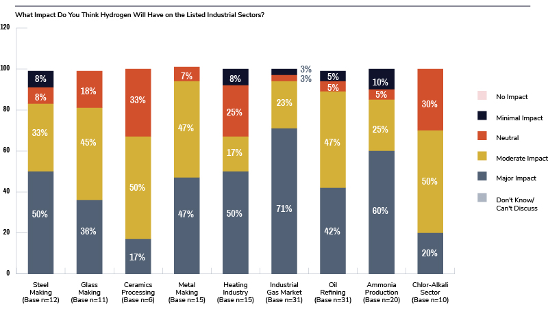 When asked how hydrogen would impact their own sectors, more than 61% of the respondents indicated that it would be a big, positive impact. This was especially true for the metal-making industry because it would potentially experience huge benefits from reduced carbon emissions, hydrogen supply costs, and more ease in obtaining hydrogen going through the gas grid.