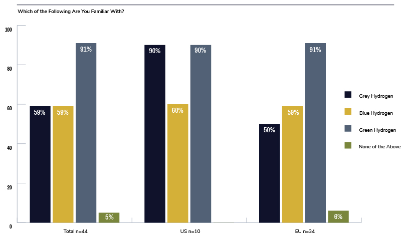Most respondents are aware of the differences among green hydrogen (made from renewable fuels with zero carbon footprint), gray hydrogen (made from fossil fuels), and blue hydrogen (made from fossil fuels with carbon capture), and over three-quarters realize the premium price placed on the cost of green hydrogen today.