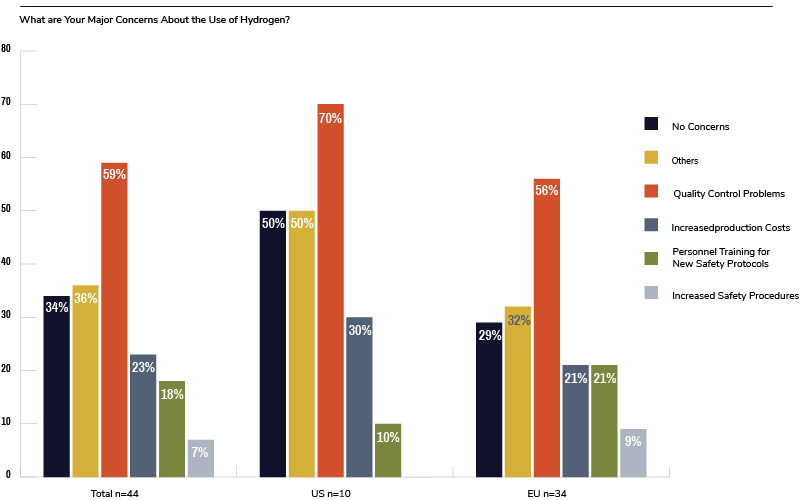 Respondents were also asked about additional impacts in being hydrogen competent. The top concerns were increased production costs, safety procedures, and personnel training, with only 23% reporting quality control problems.