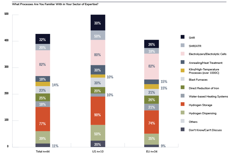 Steam-methane reforming (SMR) is the most widely used method for making hydrogen today, but only about a third of respondents were familiar with this process. The area least understood was kilns/high-temperature processes.