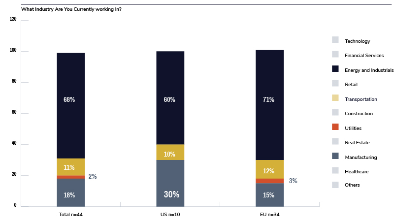This resulted in responses from 44 C-suite or senior managers from six countries in various sectors. Nearly 60% had a major influence on their decision for hydrogen, and just over 40% were the final decision-makers. A quarter of the recipients came from the U.S., and the rest consisted of an even mix from Europe, including France, UK, Spain, Italy, and Germany.I