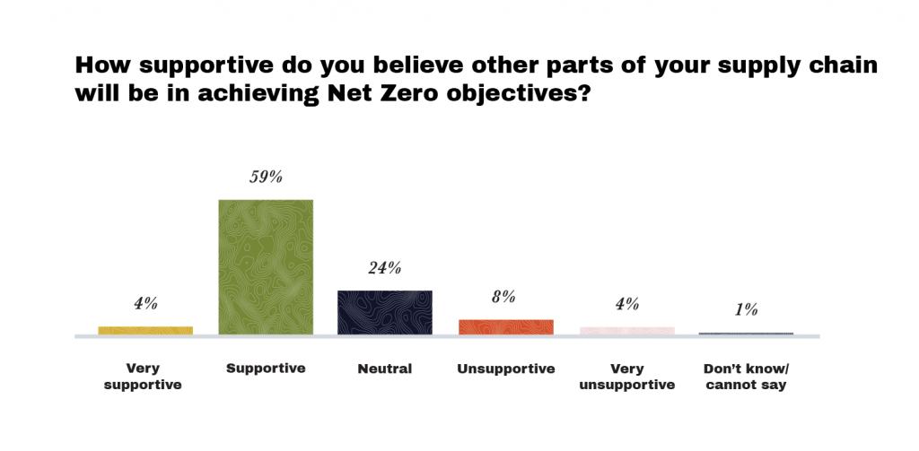 At the same time, enterprises recognize that they will need massive public support in terms of incentives, subsidies, and tax facilitations to support them all through the transition period. Sixty-three percent of enterprises expect a cooperative/supportive position from their global or regional supply chains but 24% estimate that their supply chains will be neutral in this structural decarbonization process to 2050 at European level.