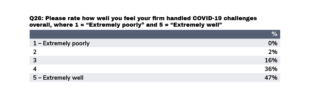When asked about how they feel their firm handled COVID-19 challenges, the overwhelming majority (83%) feel positive about their firm’s performance; only 2% felt their firms had mismanaged the crisis.