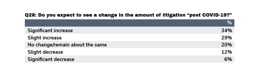 According to the survey, part of the uptick in cases will be driven by COVID-19 itself, with 54% of our respondents telling us that their clients were speaking to them about pandemic-related litigation.