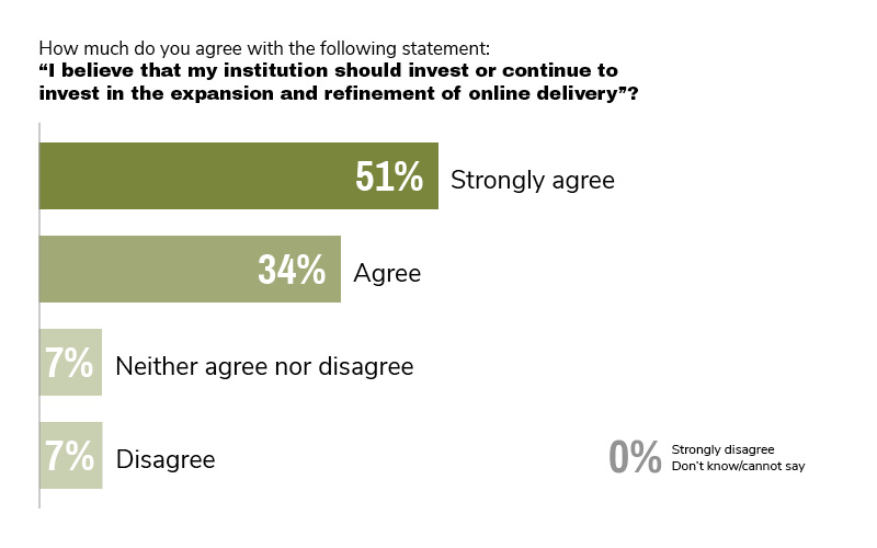 Faculty and management of private institutions are bullish on trends in online delivery, with 85% of all respondents agreeing that their institution should invest or continue to invest in the expansion and refinement of online delivery.
