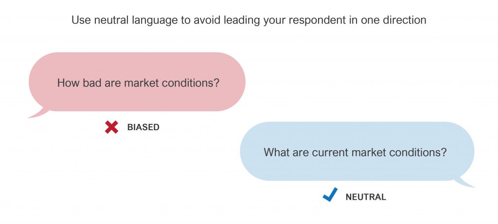 For example, a question like “How bad are market conditions?” suggests that marketing conditions are poor, forcing the respondent to answer from that perspective, resulting in an ‘echo chamber’ that needlessly reinforces bias. Researchers should instead ask, “What are current market conditions?” which allows the respondent to answer from their point of view.
