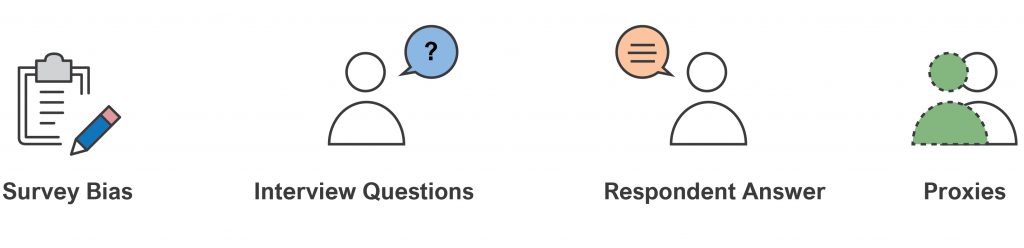 The researcher can manage all these biases except proxies. With proxies, you entirely turn your market research over to a third party and step back, trusting that they will construct the studies to support your unique needs. This can be a disconnect. Without direct access to the analysts and consultants who are doing research on your behalf, it is impossible to uncover and validate/invalidate their assumptions.