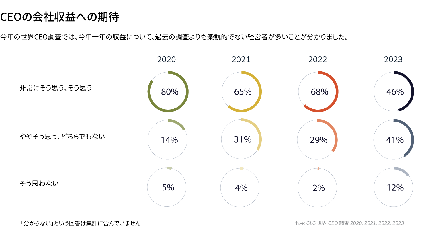 今回調査したCEOの半数弱のみが、2023年に収益が増加すると「確信している」または「非常に確信している」と答えており、より楽観的だった過去の調査とは大きな違いがみられています。