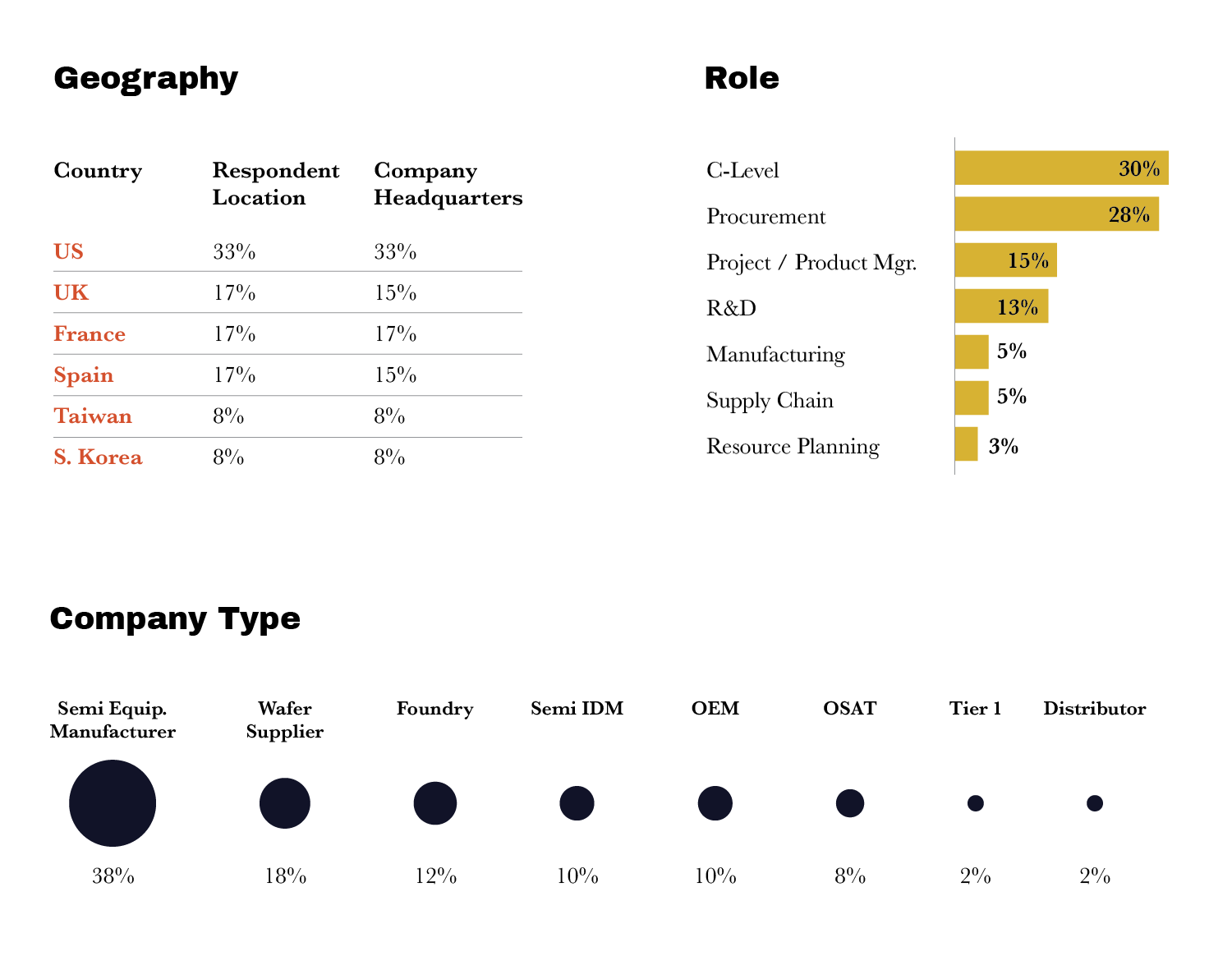 GLGは、半導体のサプライチェーンにおける現在の市場ダイナミクスについて理解するため、米国(33%)、英国(17%)、フランス(17%)、ドイツ(17%)、台湾(8%)、韓国(8%)のエグゼクティブ60名を対象に調査を実施しました。調査対象者は、Cレベルの経営層30%、調達プロフェッショナル28%、プロジェクト/プロダクトマネージャー15%、R&Dプロフェッショナル13%、製造プロフェッショナル5%、サプライチェーンプロフェッショナル5%、資源計画プロフェッショナル3%という内訳でした。 回答者は、半導体装置メーカー、ウェーハサプライヤー、ファウンドリ、半導体IDM、OEM、OSAT、ティア1、ディストリビューター、などを含む、さまざまなタイプの会社に所属しています。また、回答者はいずれも知識が豊富で、在庫レベルの予測など、企業が今後の潜在的な不足を管理するために行っている戦略的変更について説明する能力がありました。