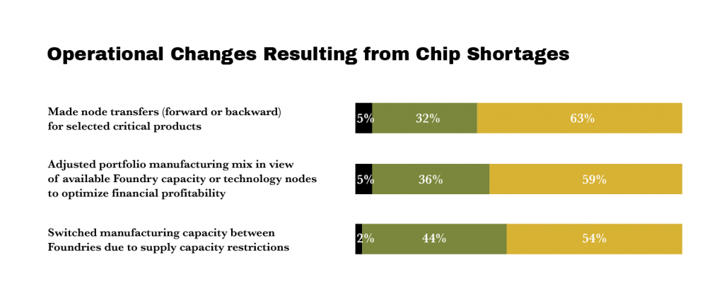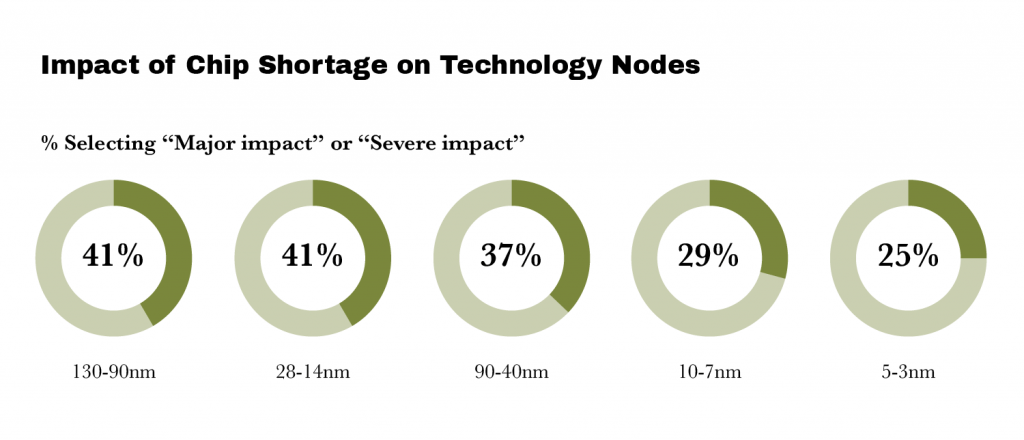 供給不足は、すべての半導体製品に同程度の影響を与えるわけではないようです。より成熟したノードが最も被害を受けると報告されており(10人中4人以上の回答者が、不足が130〜90nmおよび90〜40nmノードに重大なまたは深刻な影響を与えたと回答)、業界全体の緩和への取り組みが、主により高度なノードに集中しています。
