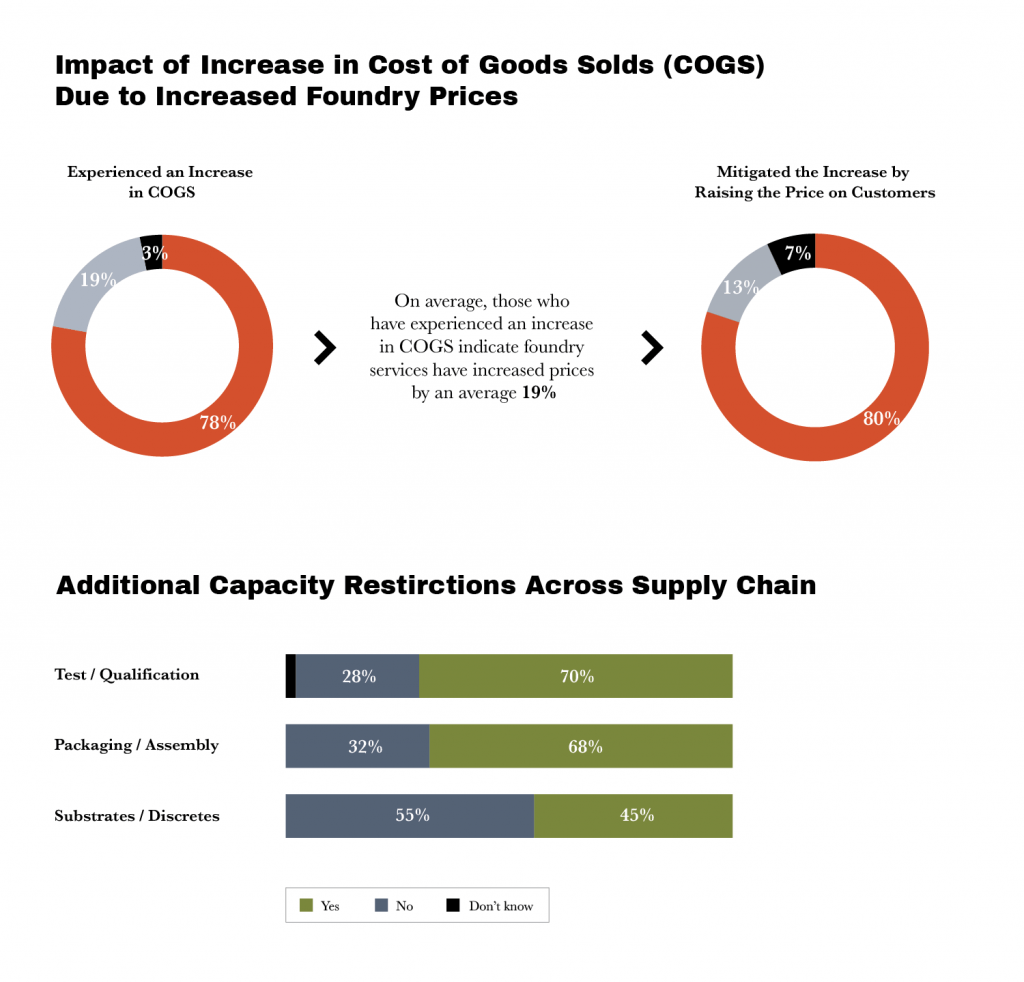 企業への影響を具体的に見てみると、回答者の約10人に8人が自社で売上原価(COGS)の増加を経験しており、ファウンドリー価格が平均19%上昇したと回答しています。これらの増加を経験した企業のうち、80%が顧客単価の引き上げによって影響を緩和していました。 さらに、今回の調査に参加した専門家はさらなる生産能力の制約も指摘しており、10人中7人が「試験/認定能力の問題」、ほぼ同人数が「パッケージング/組み立て」の問題を経験していると回答しました。