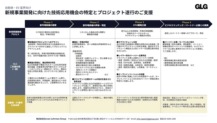 GLGの受託調査は、貴社のコア技術や素材の応用、新市場候補の評価と特定など、貴社のビジネス拡大に貢献するための調査を実施します。サプライチェーン分析、オープンイノベーションの協議、パートナー企業の選定など、様々なシーンで有識者の知見と人脈を活用いただけます。