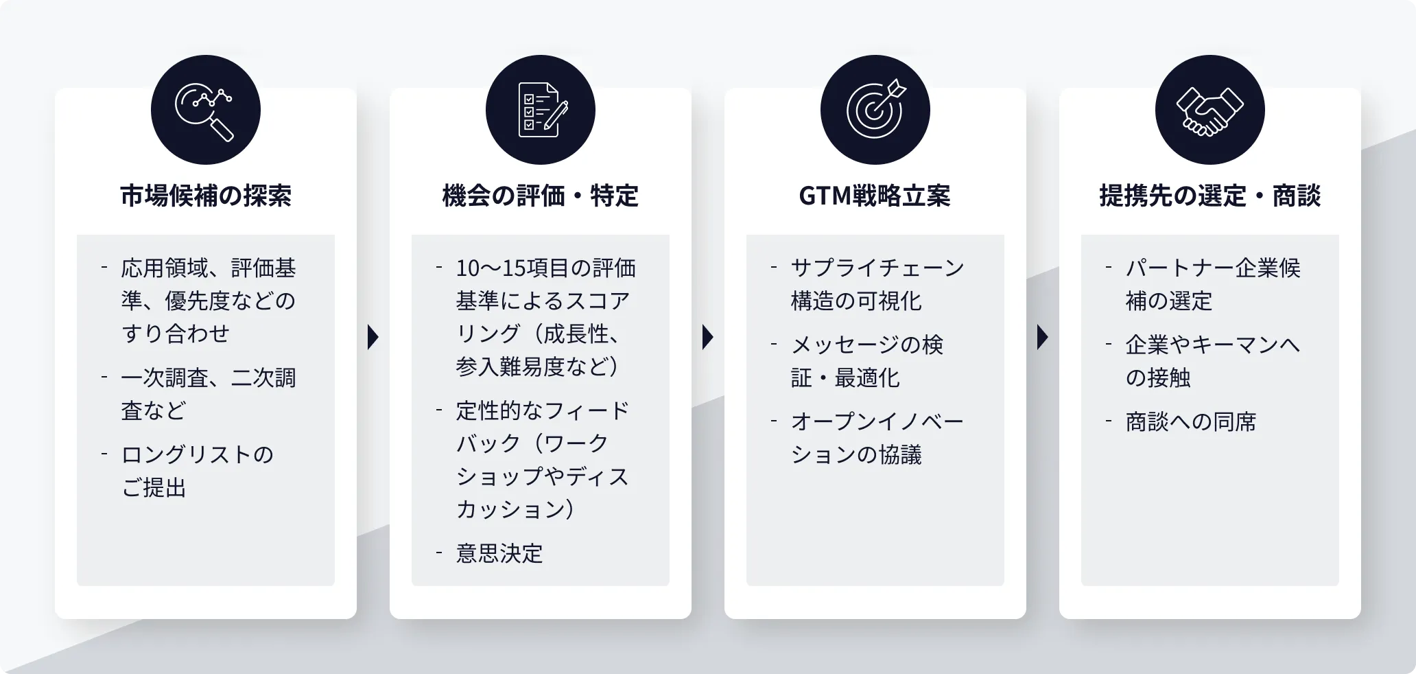 ビジネス機会の模索、成長性や競合性を加味した参入う市場のの特定、サプライチェーン分析、パートナー開拓など、ご支援範囲の項目例や具体的な進め方などをご紹介しています。