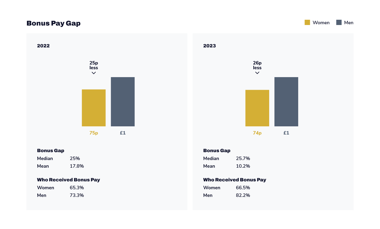 We note that the percentage of women amongst our UK professionals has increased since we first started reporting in 2021. Most notably, today, women represent 56.3% of our UK top earners (i.e., our Upper Quartile), and 66.3% of our Upper Middle Quartile. This represents an increase of 7% and 4.3%, respectively, since 2021. Further, our average hourly pay gap has improved 3.4% since 2021 and our average gender pay gap for bonus pay has improved 21.4% since 2021.