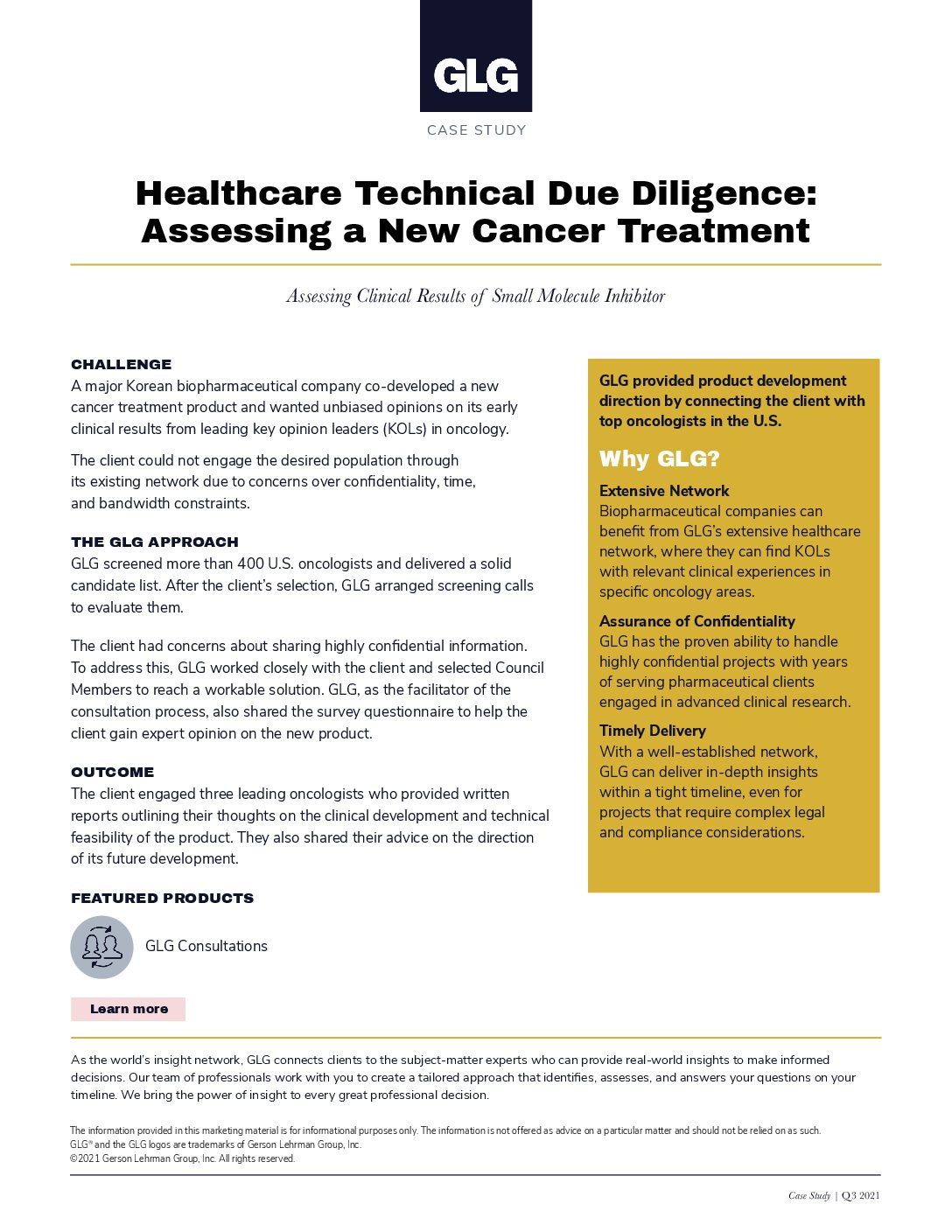 GLG는 수년간 최첨단 임상 연구를 진행하는 여러 제약사에 서비스를 제공하며 고객사의 극비 프로젝트를 성공적으로 지원해왔습니다.